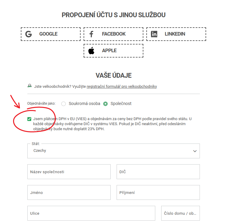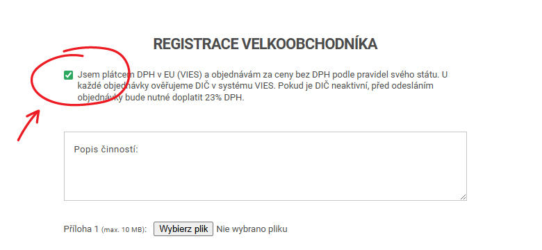 3. Zaškrtněte checkbox, kterým potvrzujete, že Vaše firma má aktivní IČ DPH EU (ověření probíhá v systému VIES: odkaz):
