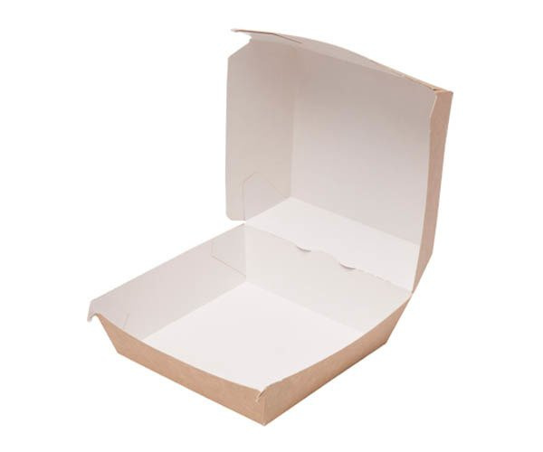 Ekologické, uzavíratelné kartonové krabičky na hamburgery o rozměrech 14,5 cm x 14,5 cm x 10 cm. Vyrobena z 100% papíru.