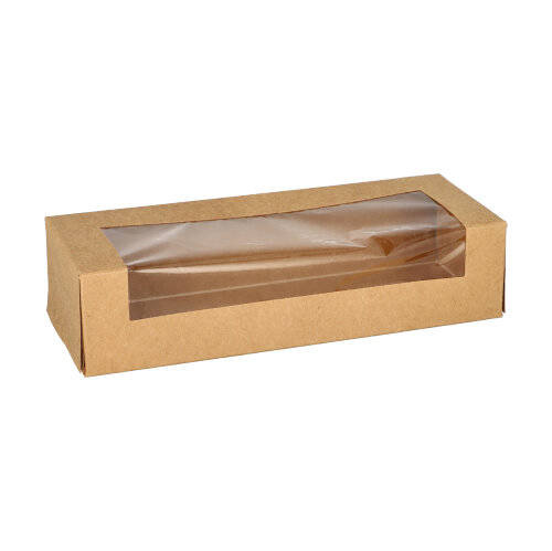 Hnědé papírové obaly na sushi. Mají rozměry 19,5 cm x 7 cm x 4,5 cm. Krabice jsou vyrobeny z 100% papíru, a okénko z biologicky odbouratelného materiálu - PLA (kukuřičná mouka).