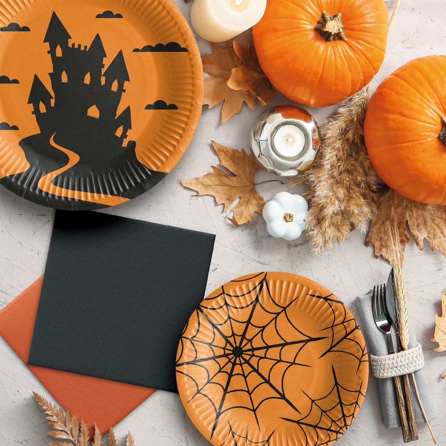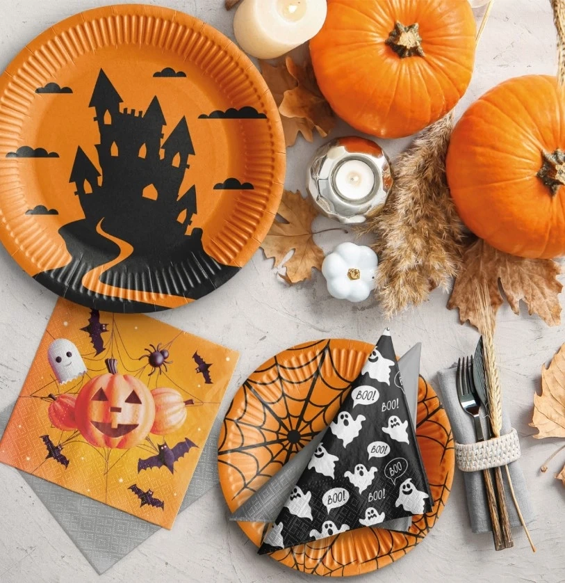 Ekologiczne, okrągłe, płaskie talerze z motywem "Halloween", o średnicy 23 cm wykonane w 100% z papieru.