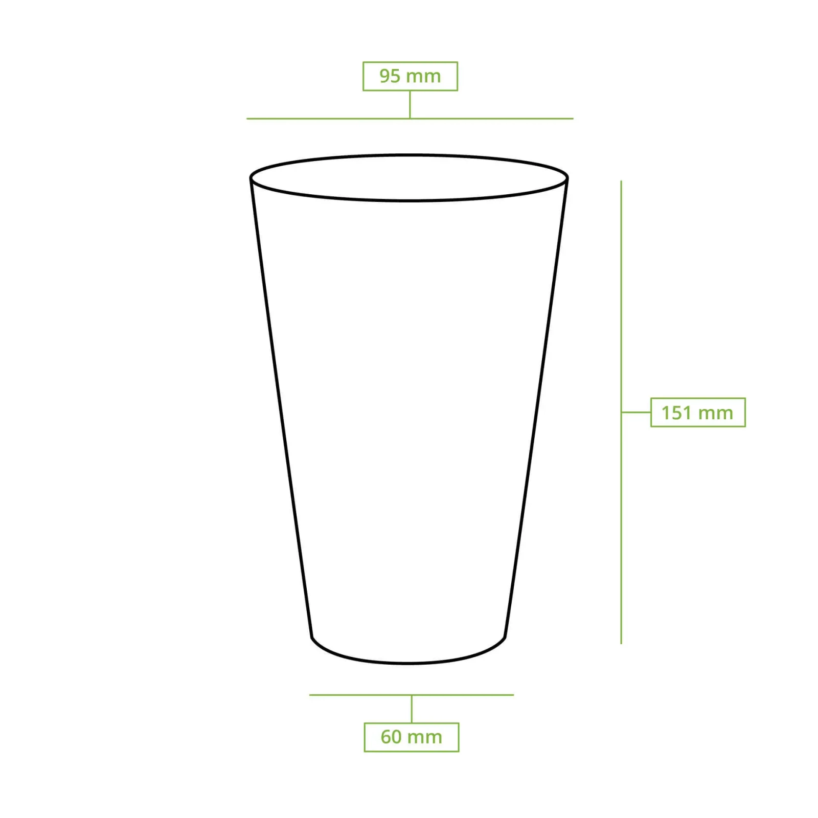 Poháry s objemem 500 ml a průměrem 95 mm. Celkově vyrobené z PLA (materiál na bázi kukuřičné mouky)*.
