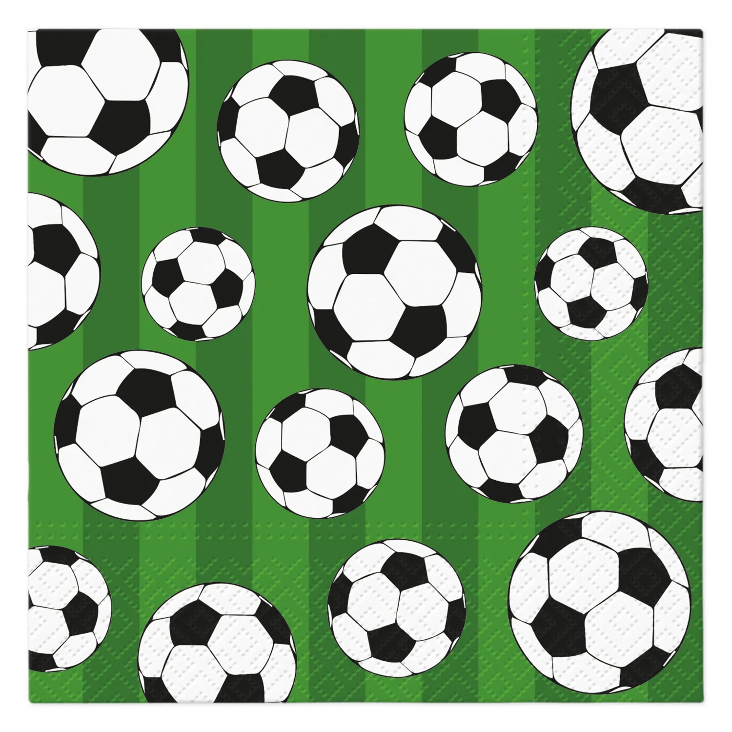 Třívrstvé ubrousky „Soccer Ball“ o rozměrech 33 cm x 33 cm (složené - 16,5 cm x 16,5 cm). Vyrobené ze 100 % papírové buničiny.