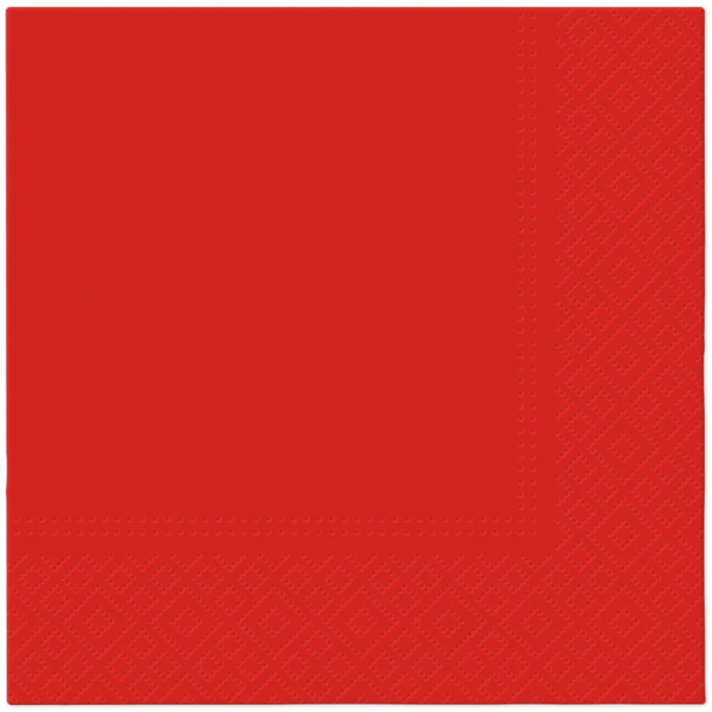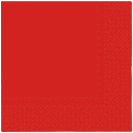 Červené třívrstvé ubrousky o rozměrech 33 cm x 33 cm, skládané na 1/4. Vyrobeny ze 100% buničitého papíru.