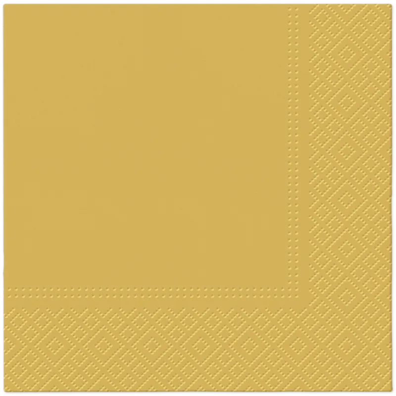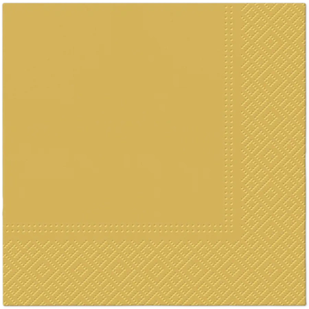 Zlatý třívrstvé ubrousky o rozměrech 33 cm x 33 cm, skládané na 1/4. Vyrobeny ze 100% buničitého papíru.