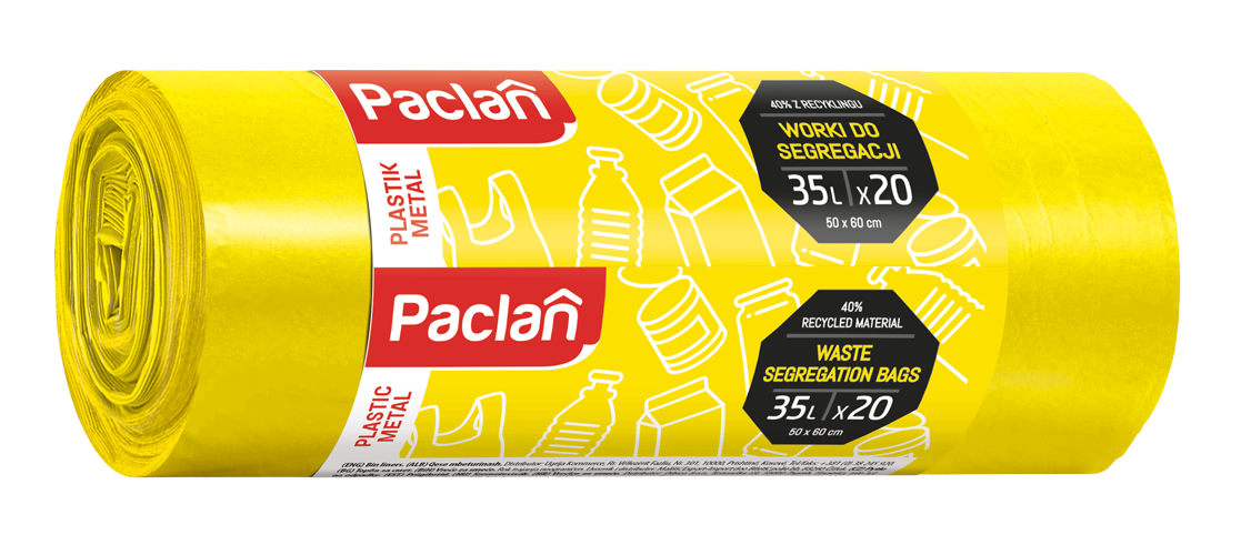 Barevné pytle na odpadky značky Paclan ve žluté barvě, určené pro třídění plastů a kovů. Balení obsahuje 20 kusů pytlů o objemu 35 l.