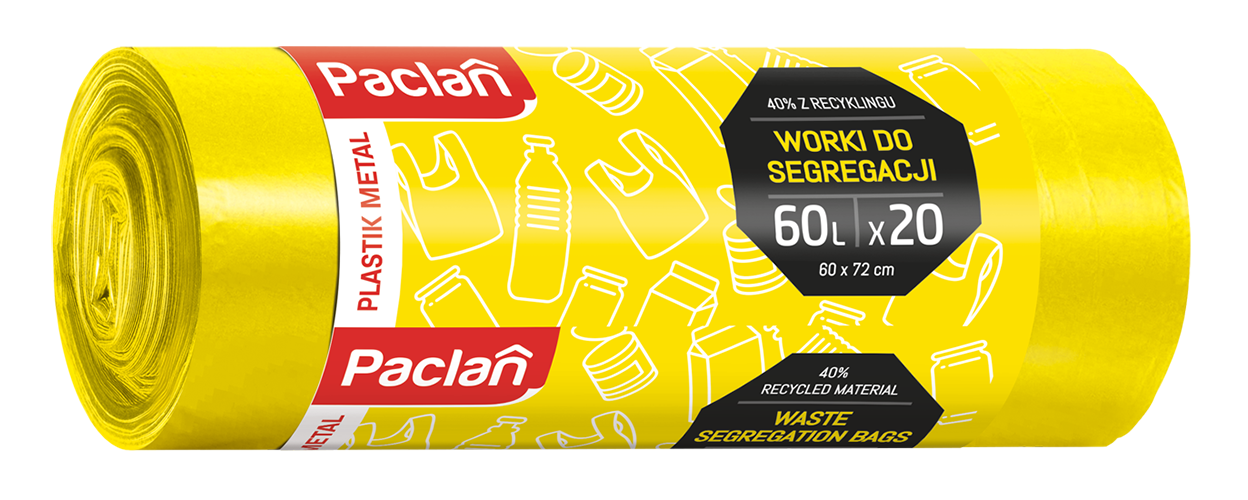 Barevné pytle na odpadky značky Paclan ve žluté barvě, určené pro třídění plastů a kovů. Balení obsahuje 20 kusů pytlů o objemu 60 l.