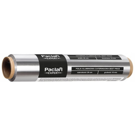 Potravinářská hliníková fólie o šířce 29 cm, délce 60 m a tloušťce 15 μm (velmi silná!), v roli. Produkt značky Paclan.