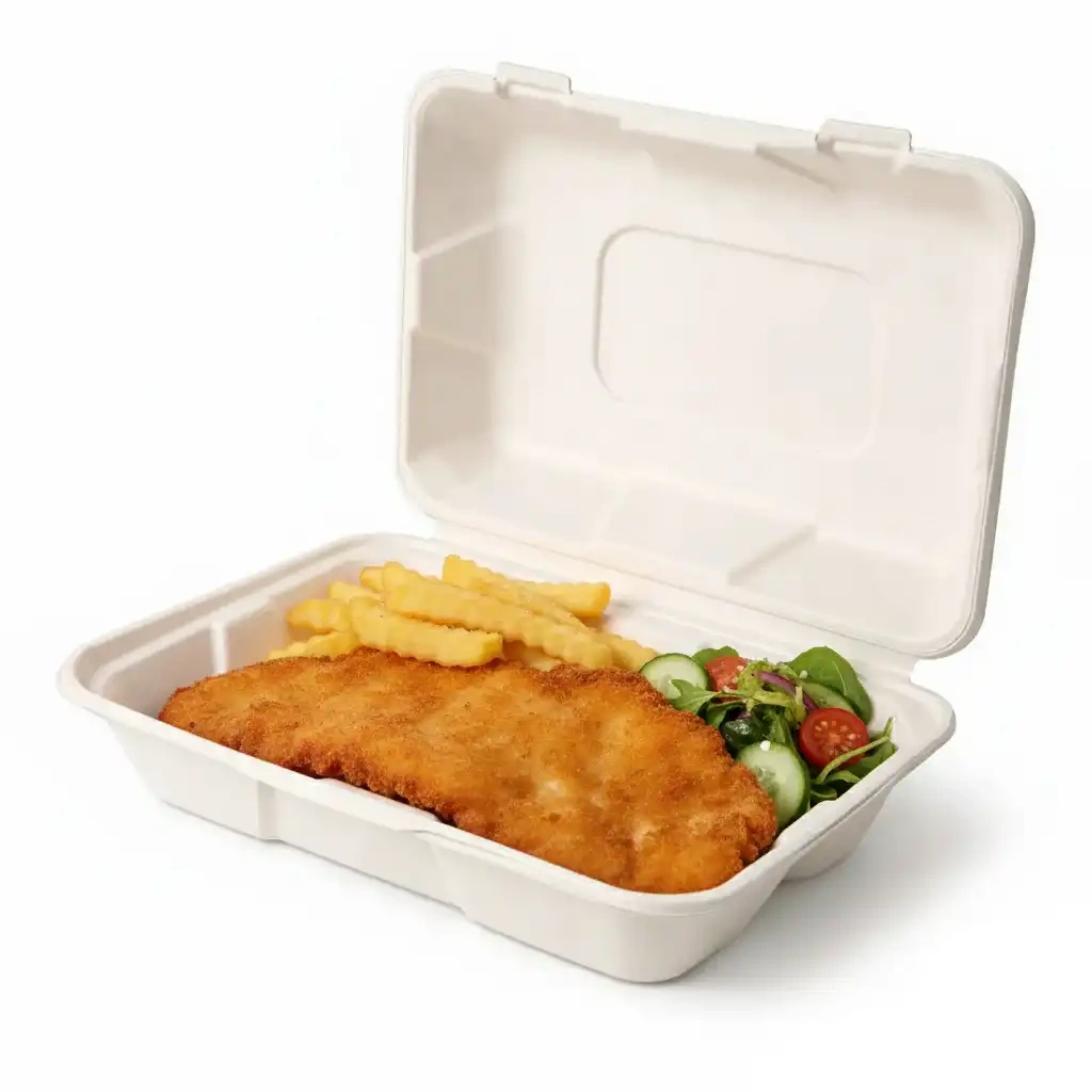Zavíratelné, nerozdělitelné krabice o objemu 1000 ml a rozměrech 23 cm x 15,5 cm x 8 cm, celé vyrobené z cukrové třtiny. Tento materiál přírodního původu se skvěle osvědčuje při skladování nebo přenášení jídla - díky velmi dobrým tepelným vlastnostem jídlo zůstává dlouho horké a křupavé.