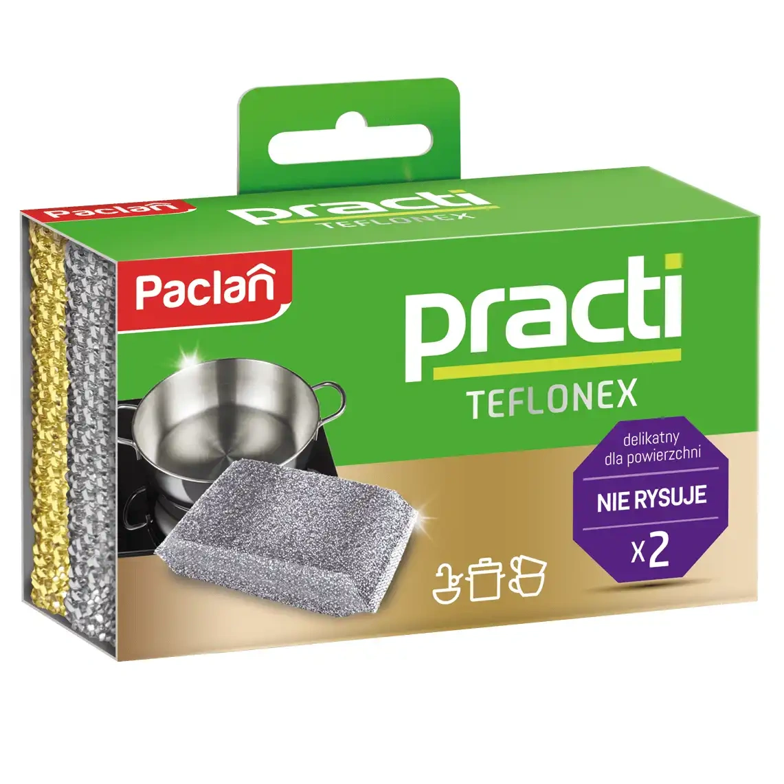 Kuchyňské houbičky Paclan Teflonex kombinují účinnost čištění s jemností pro teflonové povrchy. Balení obsahuje 2 kusy houbiček ve stříbrné barvě, každá o rozměrech 11 x 7 cm.
