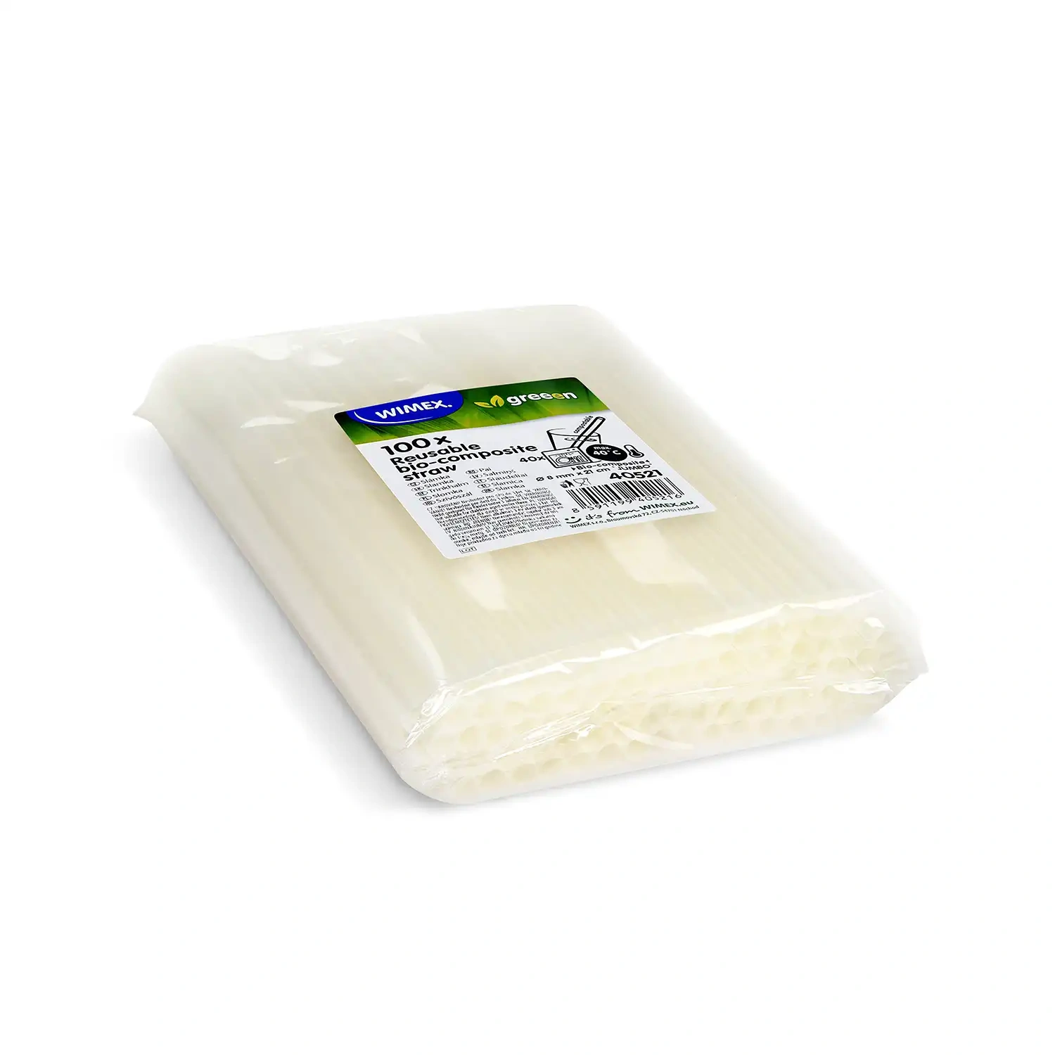 Bílé opakovaně použitelná brčka vyrobená z biokompozitu. Mají průměr 8 mm a délku 210 mm. Balení obsahuje 100 ks.