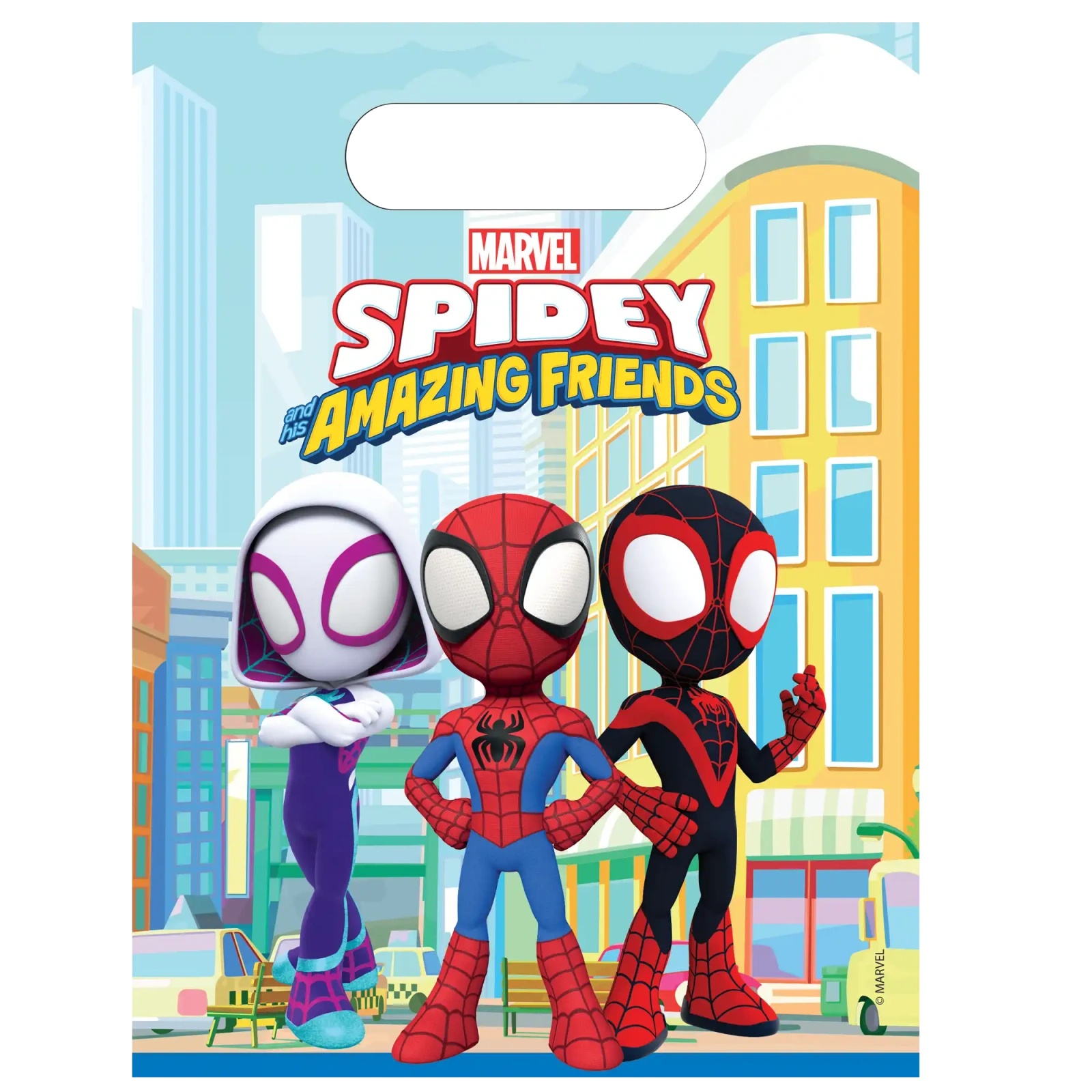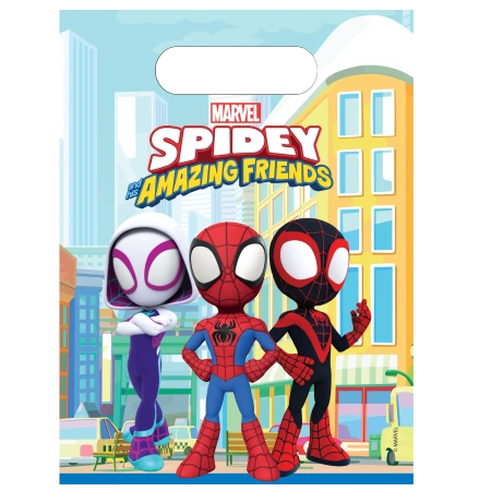 Sada 6 ks fóliových dárkových sáčků s motivem Spidey o rozměrech 17 × 23 cm je praktický a efektní způsob balení sladkostí nebo drobných dárků.