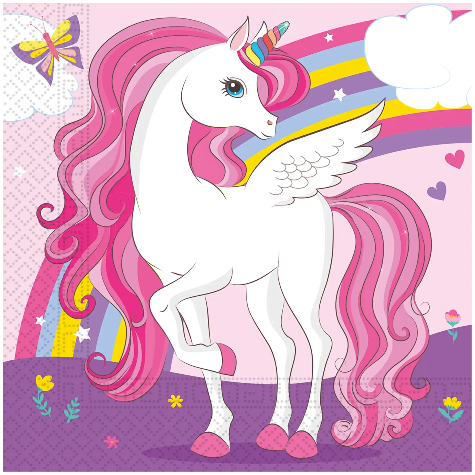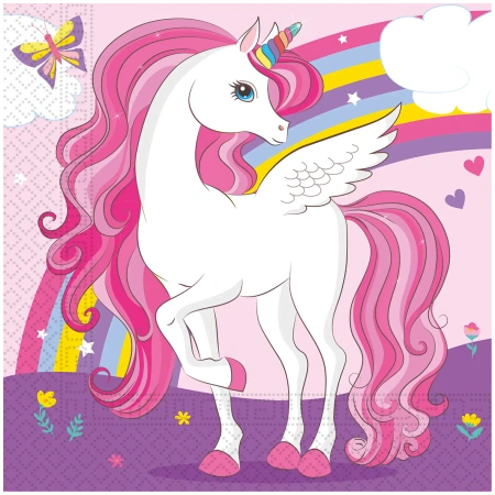Sada 20 ks dvouvrstvých dekorativních ubrousků s motivem Unicorn o rozměrech 33 × 33 cm, vyrobených ze 100 % papíru, je praktický a dekorativní doplněk na narozeniny a jiné dětské oslavy. Ubrousky se skvěle hodí k prostírání, dodávají oslavě barevný a tematický charakter.