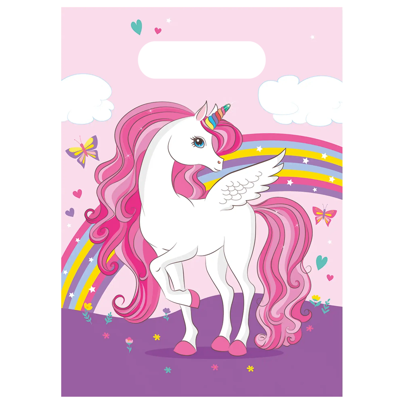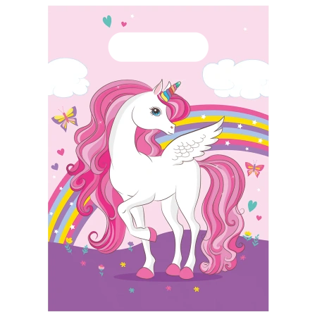 Sada 6 ks fóliových dárkových sáčků s motivem Unicorn o rozměrech 17 × 23 cm je praktický a efektní způsob balení sladkostí nebo drobných dárků.