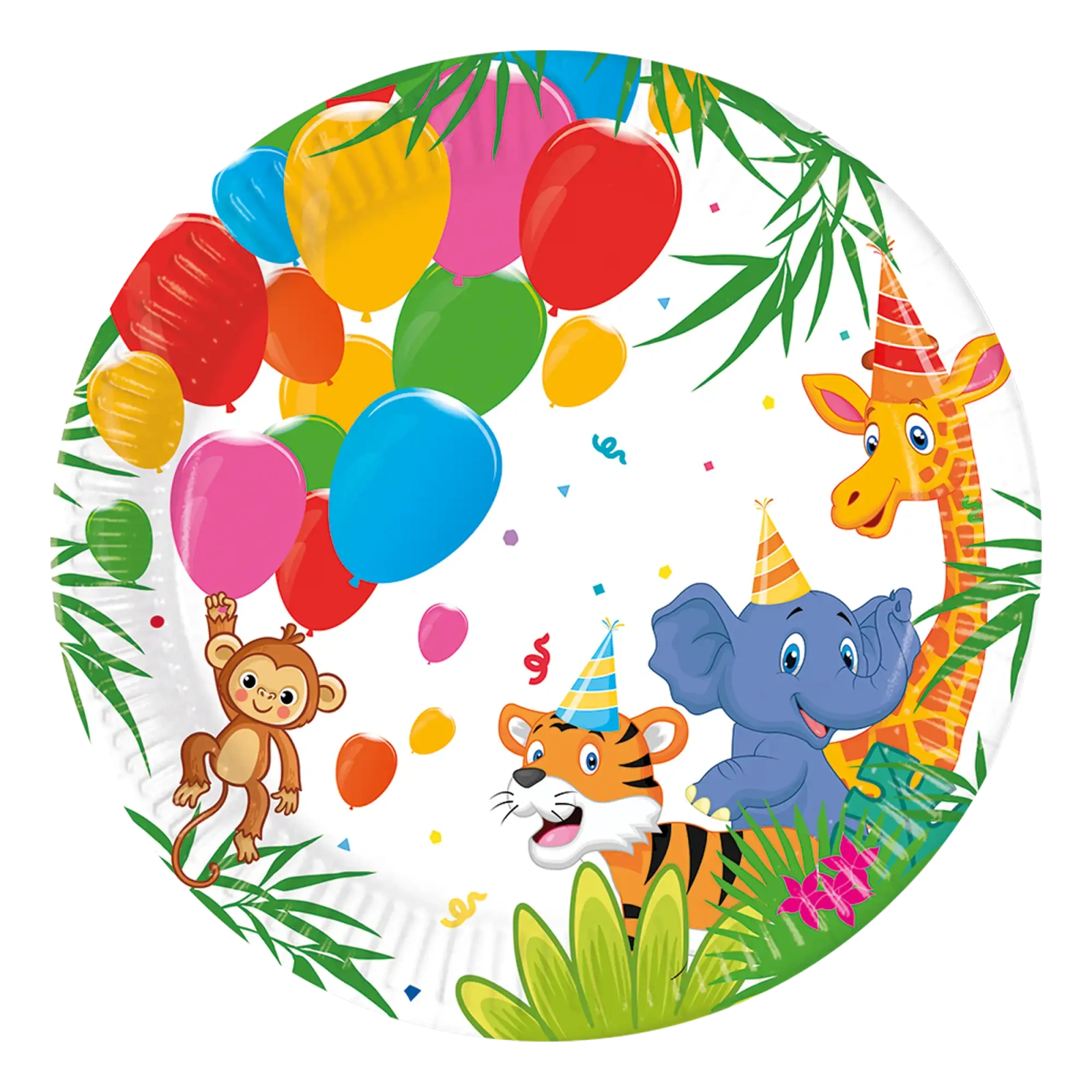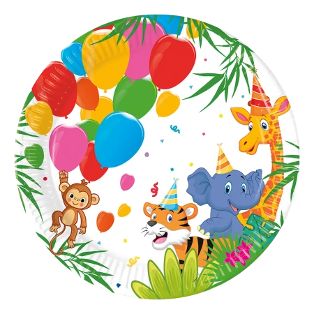 Sada 8 kulatých, plochých papírových talířů s motivem Jungle o průměru 20 cm, vyrobených ze 100% papíru je praktickým a ekologickým doplňkem na narozeniny a jiné dětské oslavy. Talíře se skvěle hodí k servírování pochoutek a jídel, přinášejí barevný tematický prvek na stůl a podtrhují radostnou atmosféru oslavy.