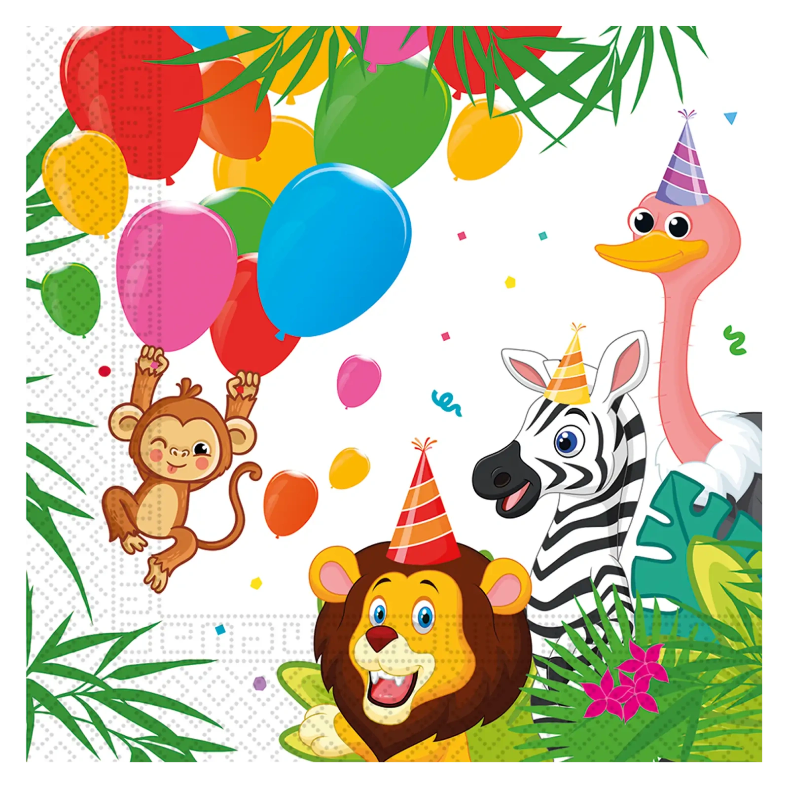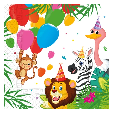 Sada 20 ks dvouvrstvých dekorativních ubrousků s motivem Jungle o rozměrech 33 × 33 cm, vyrobených ze 100 % papíru, je praktický a dekorativní doplněk na narozeniny a jiné dětské oslavy. Ubrousky se skvěle hodí k prostírání, dodávají oslavě barevný a tematický charakter.